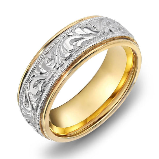 The Henry Band in 14K gold features intricate hand-engraved detailing framed by polished edges — a timeless design for those who appreciate old-world craftsmanship.