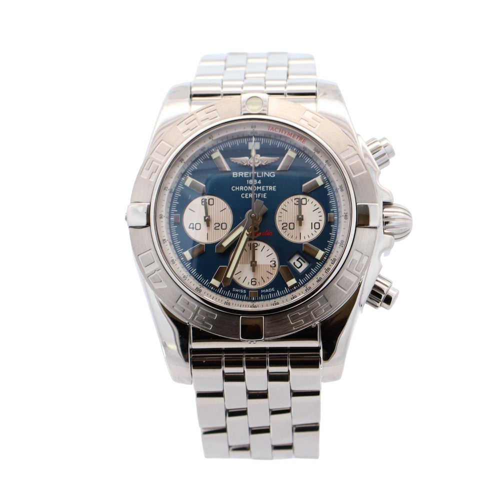 Breitling Chronomat Stainless Steel 44mm Blue Chronograph Stick Dial Watch Ref# AB0110