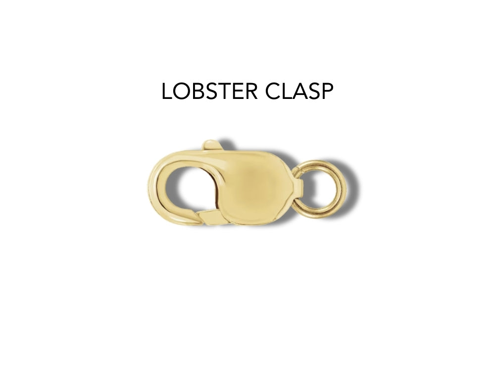 A lobster clasp is a popular and reliable closure shaped like a lobster claw, often used on necklaces and bracelets. It opens with a small spring-loaded lever and snaps shut for a secure hold. Lobster clasps are easy to use and ideal for both lightweight and medium-weight jewelry. The size of the lobster clasp can vary depending on the style and weight of the chain.