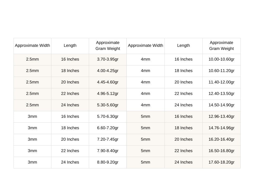 Chain weight, width, and thickness may vary slightly due to the manufacturing process. These variations are normal and can occur based on the style, design, and how each chain is crafted.