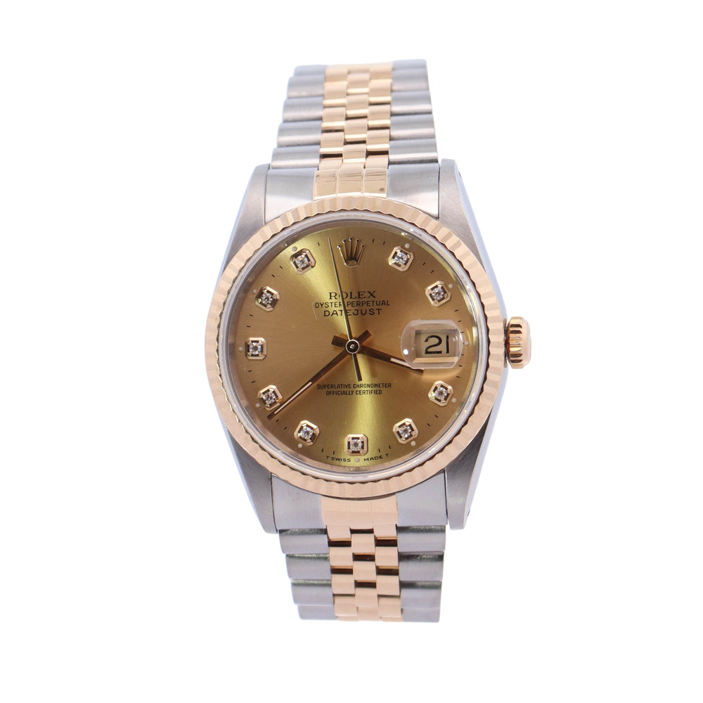 Rolex Datejust Two Tone Steel & Yellow Gold 36mm Champagne Diamond Dot Dial Watch Reference #: 16233