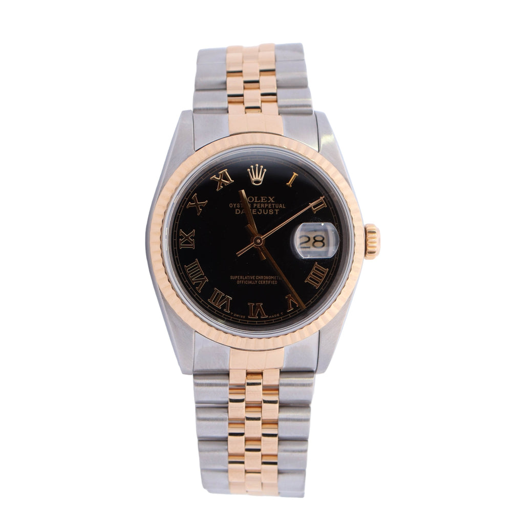 Rolex Datejust Two Tone Yellow Gold & Steel Black Roman Dial Watch Reference #: 16233