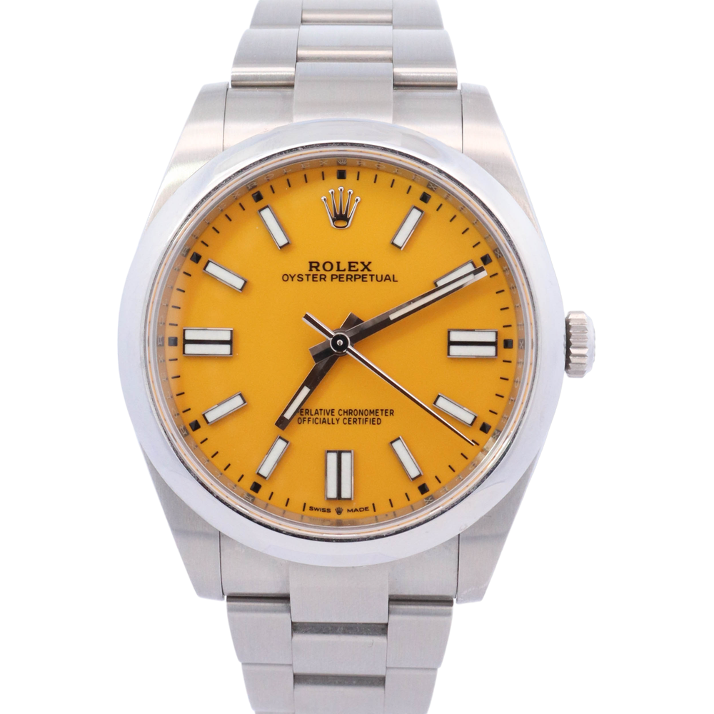 Rolex Oyster Perpetual 41mm Stainless Steel Yellow Stick Dial Watch Reference# 124300