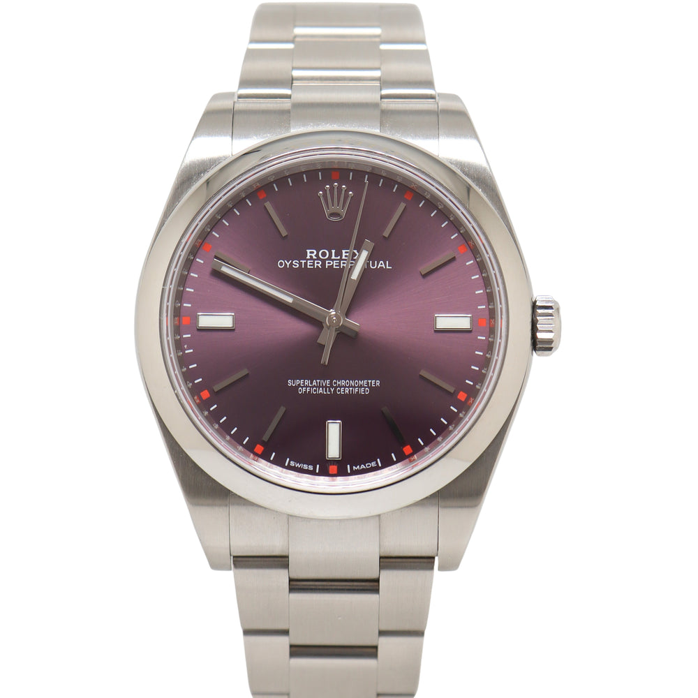 Rolex Oyster Perpetual Stainless Steel 39mm Red Grape Stick Dial Watch Reference# 114300