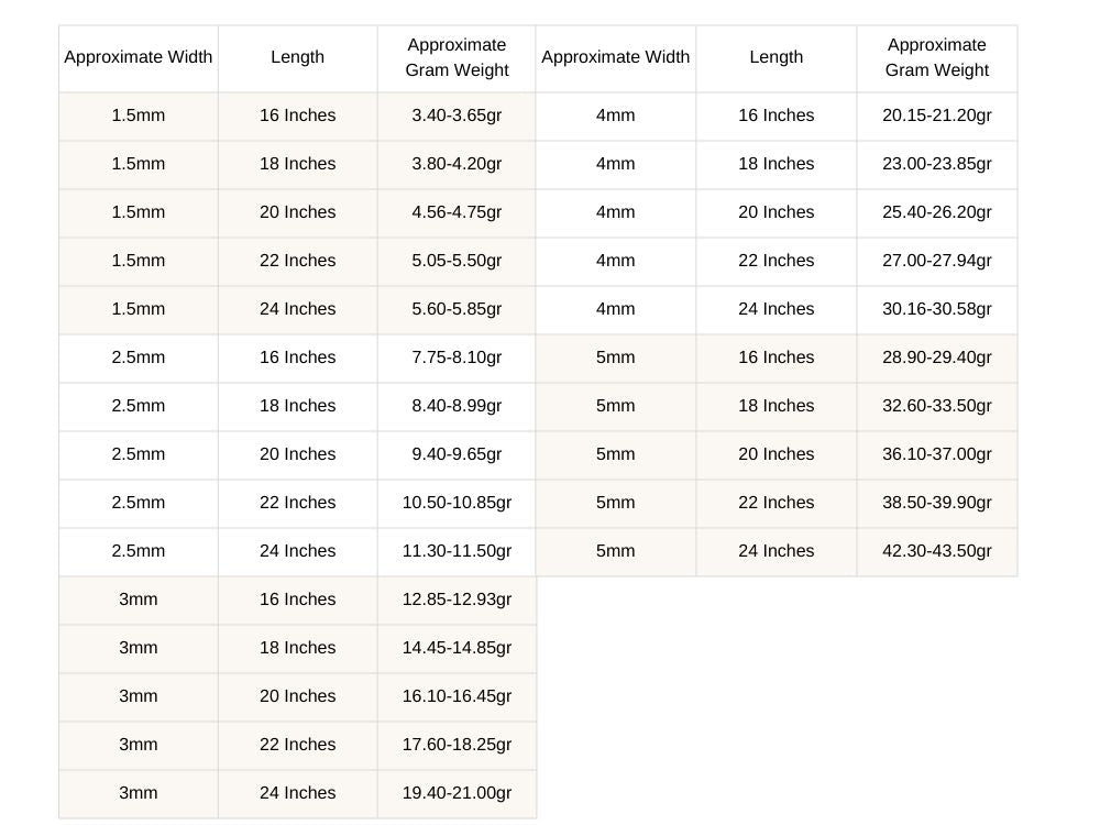 Chain weight, width, and thickness may vary slightly due to the manufacturing process. These variations are normal and can occur based on the style, design, and how each chain is crafted.