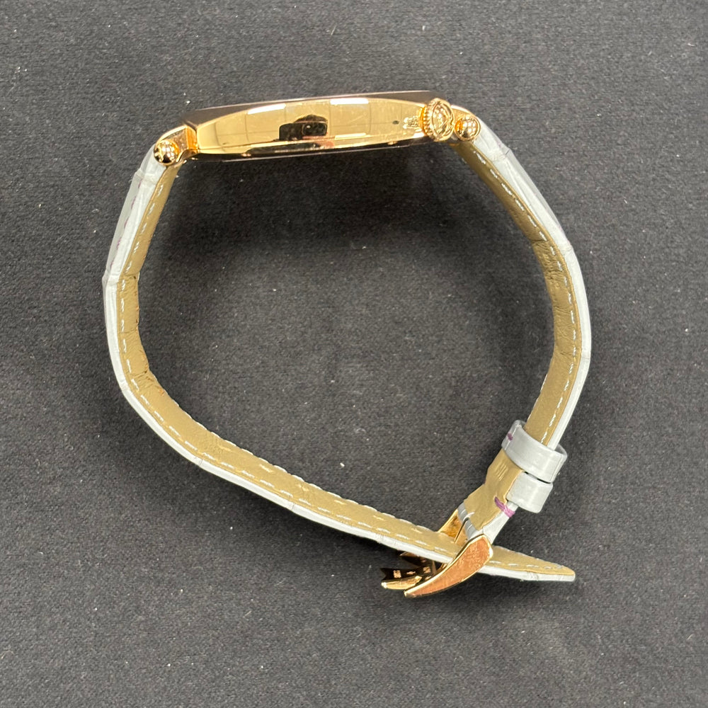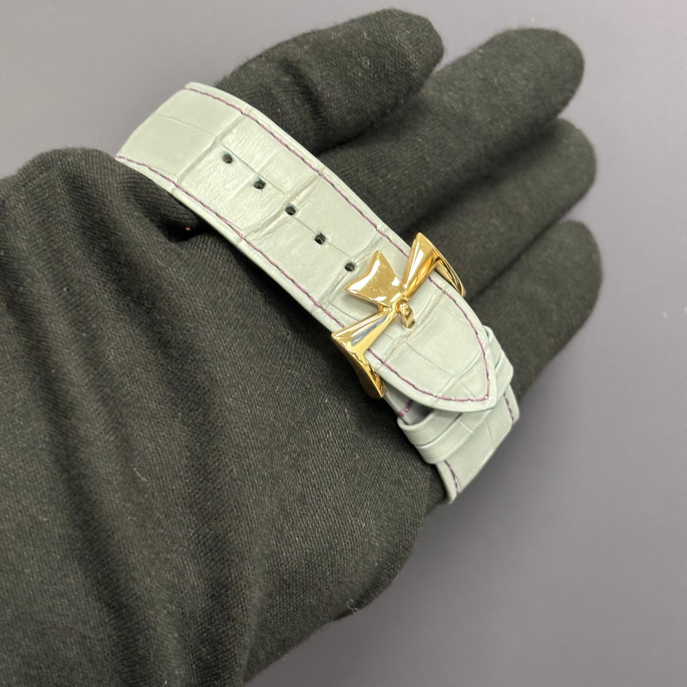 | Bracelet Style and Material | Grey/Blue Leather Strap w/ Pink Stitching |